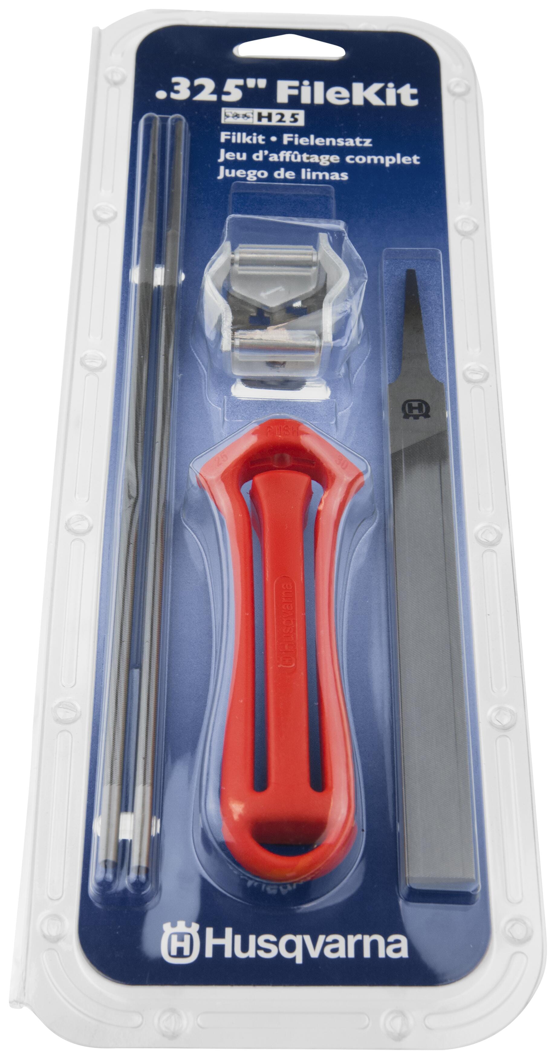 Komplett filesett som gjør det enklere å holde kjedet skarpt. Med et riktig filt kjede blir arbeidet enklere og tryggere. Filesettet inneholder et filhåndtak, en kombinasjonsmal eller en filmal og en dybdemåler, to rundfiler og én flat fil.